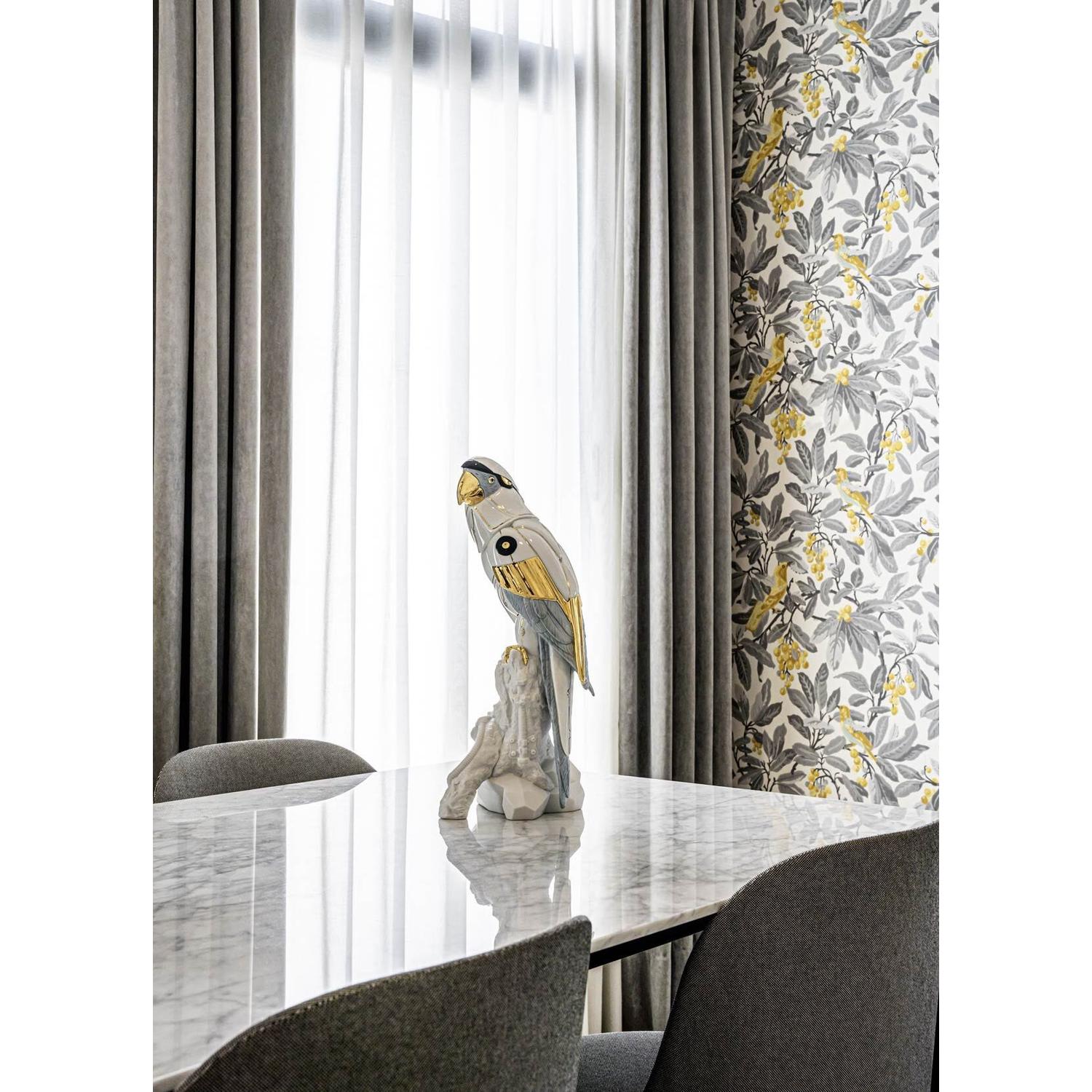 Le forme inconfondibili dell'ara, modellate con maestria nella porcellana bianca e lucida, assumono un significato completamente nuovo grazie a decorazioni e ornamenti unici. I dettagli in oro, nero e grigio-blu esaltano la figura, creando un contrasto sorprendente che cattura l'attenzione.