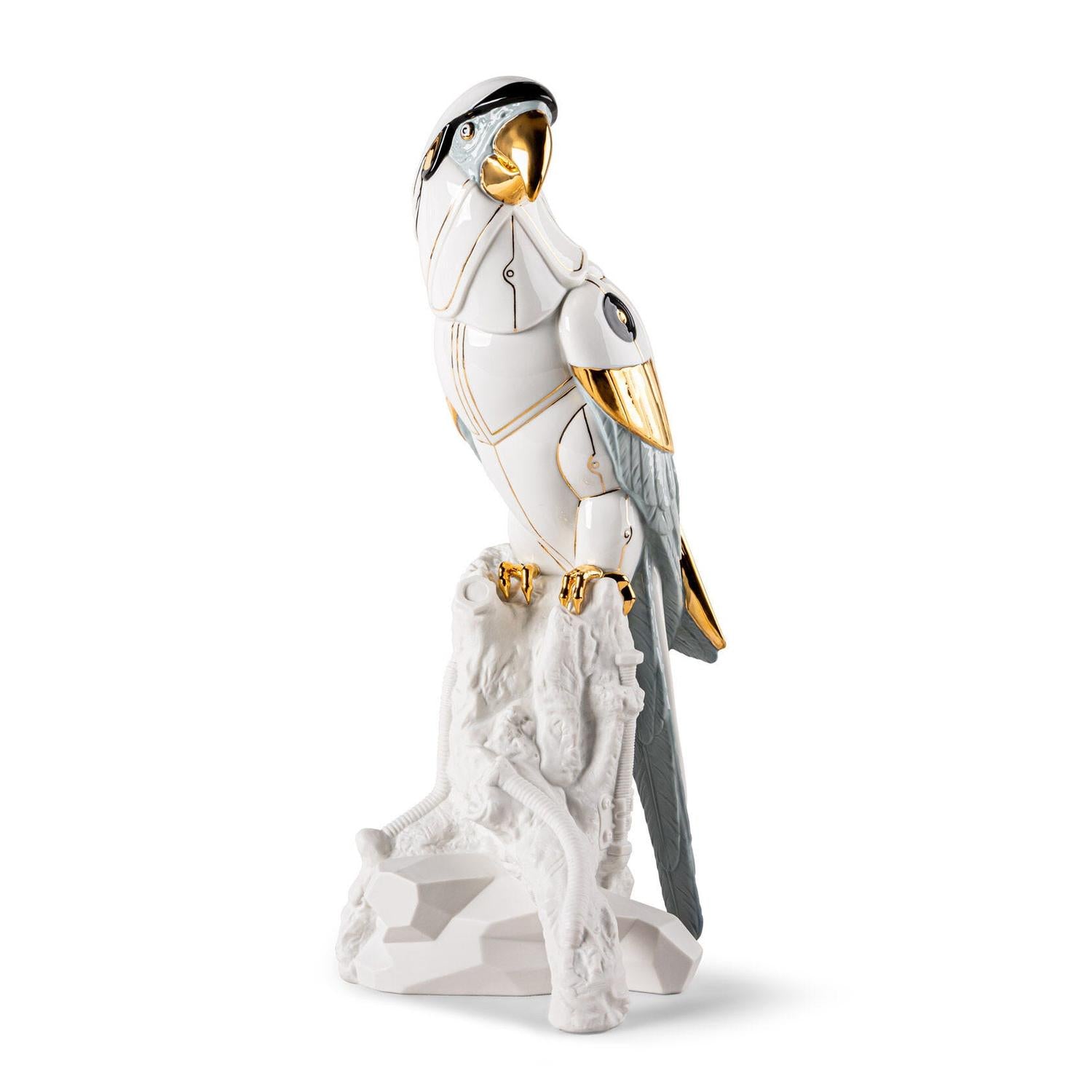 Le linee geometriche che delineano la struttura del pappagallo sono arricchite da una dettagliata ornamentazione in rilievo, con parti decorate a lustro dorato che conferiscono un effetto metallico e robotico. Questa creazione non si distingue solo per il suo tema futuristico, ma anche per la precisione e delicatezza della lavorazione in porcellana.