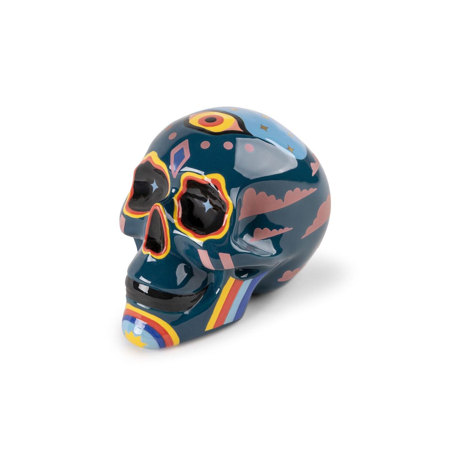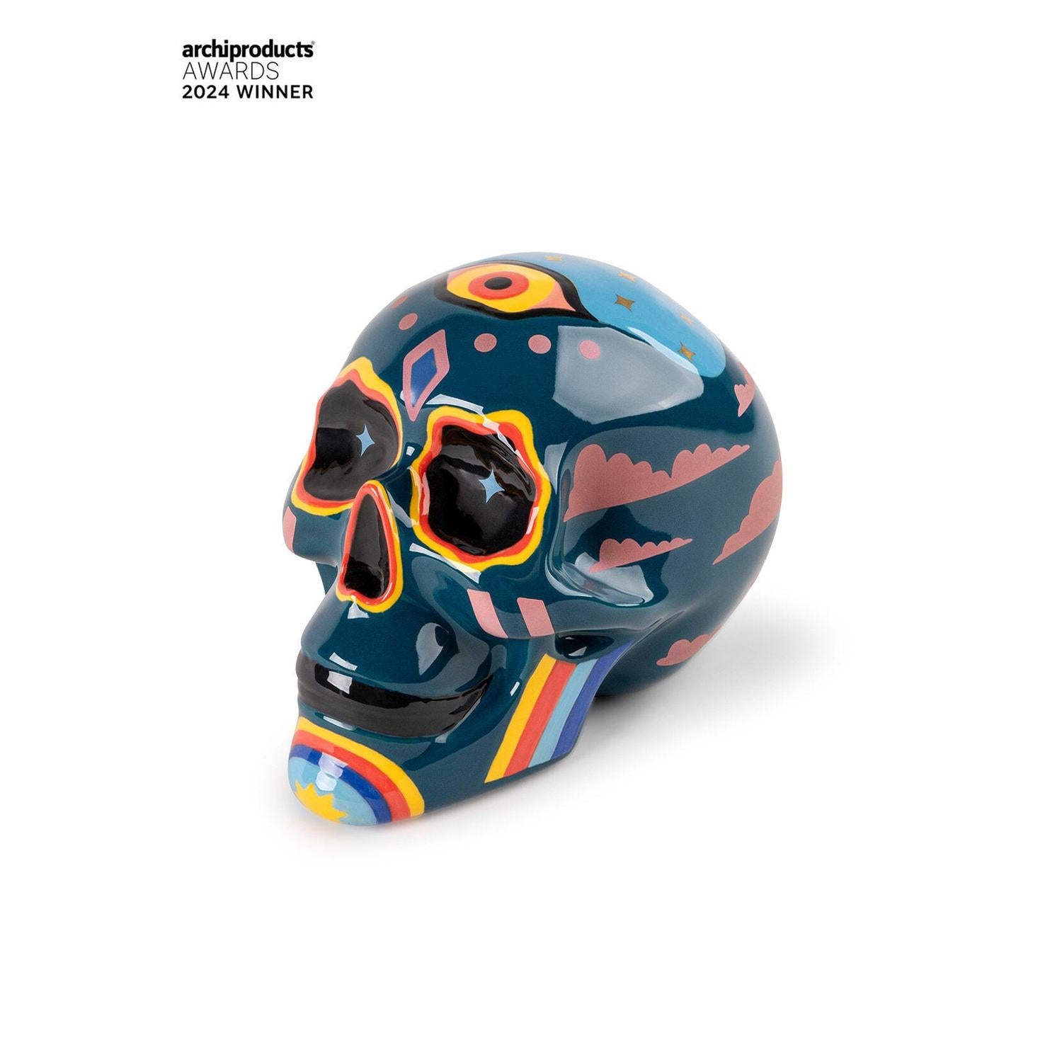 Il teschio, come tutte le creazioni Lladró, è interamente realizzato in porcellana. Per la sua decorazione, Laprisamata ha scelto elementi onirici e motivi ornamentali ricchi di significato. Ad esempio, spicca un cielo stellato, ispirato ai sarcofagi egiziani, che simboleggia l'eternità, un concetto centrale nella visione del mondo di questa antica civiltà. Inoltre, è presente il terzo occhio, un simbolo radicato nelle culture asiatiche, che rappresenta la spiritualità e la capacità di vedere oltre il mondo materiale.