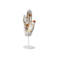 La Mudra Protezione si ispira a questi gesti millenari ed è rappresentata da una mano alzata con il palmo rivolto in avanti. In questa versione particolare, la mano è arricchita da motivi vegetali minuziosamente incisi, che si intrecciano tra le dita, e da un fiore di porcellana posizionato sul pollice, come se fosse parte integrante del disegno che prende vita.