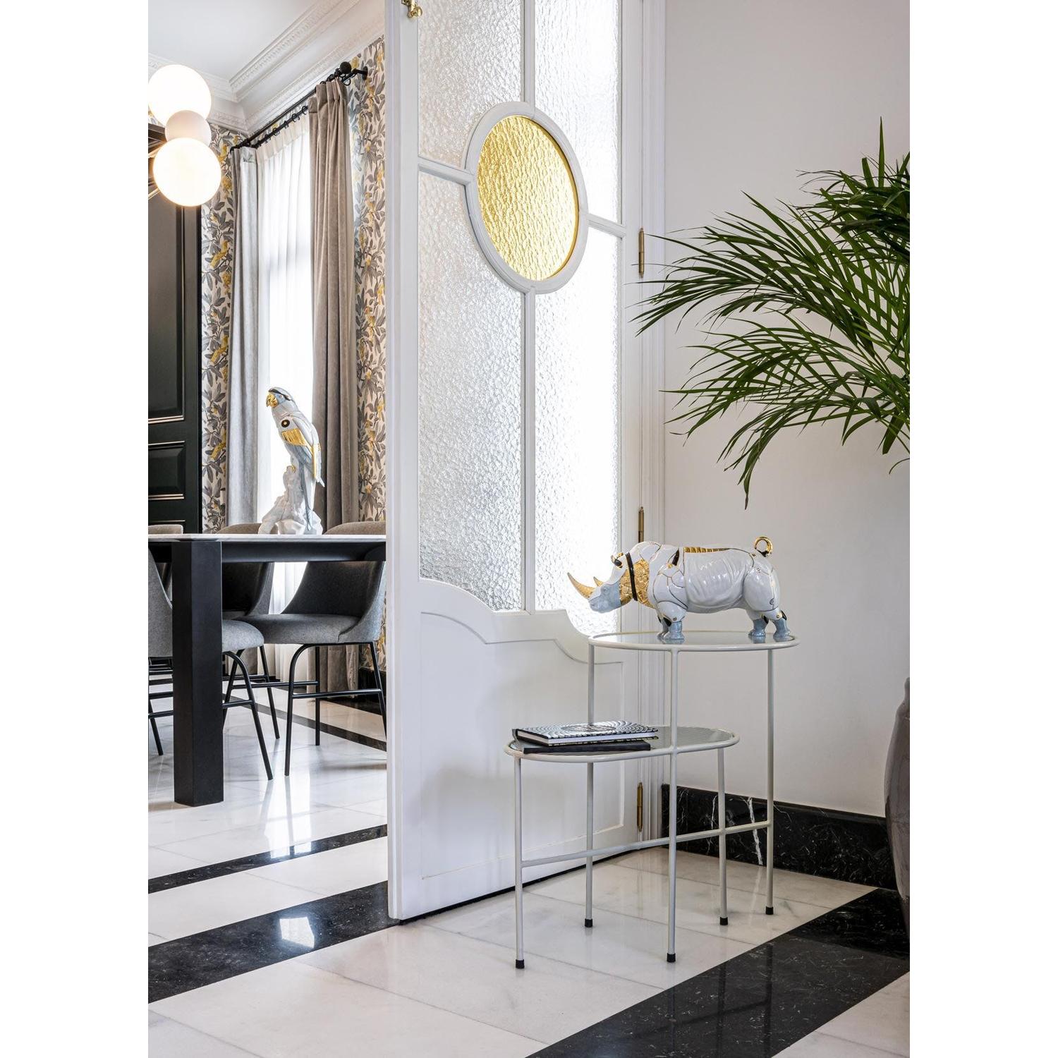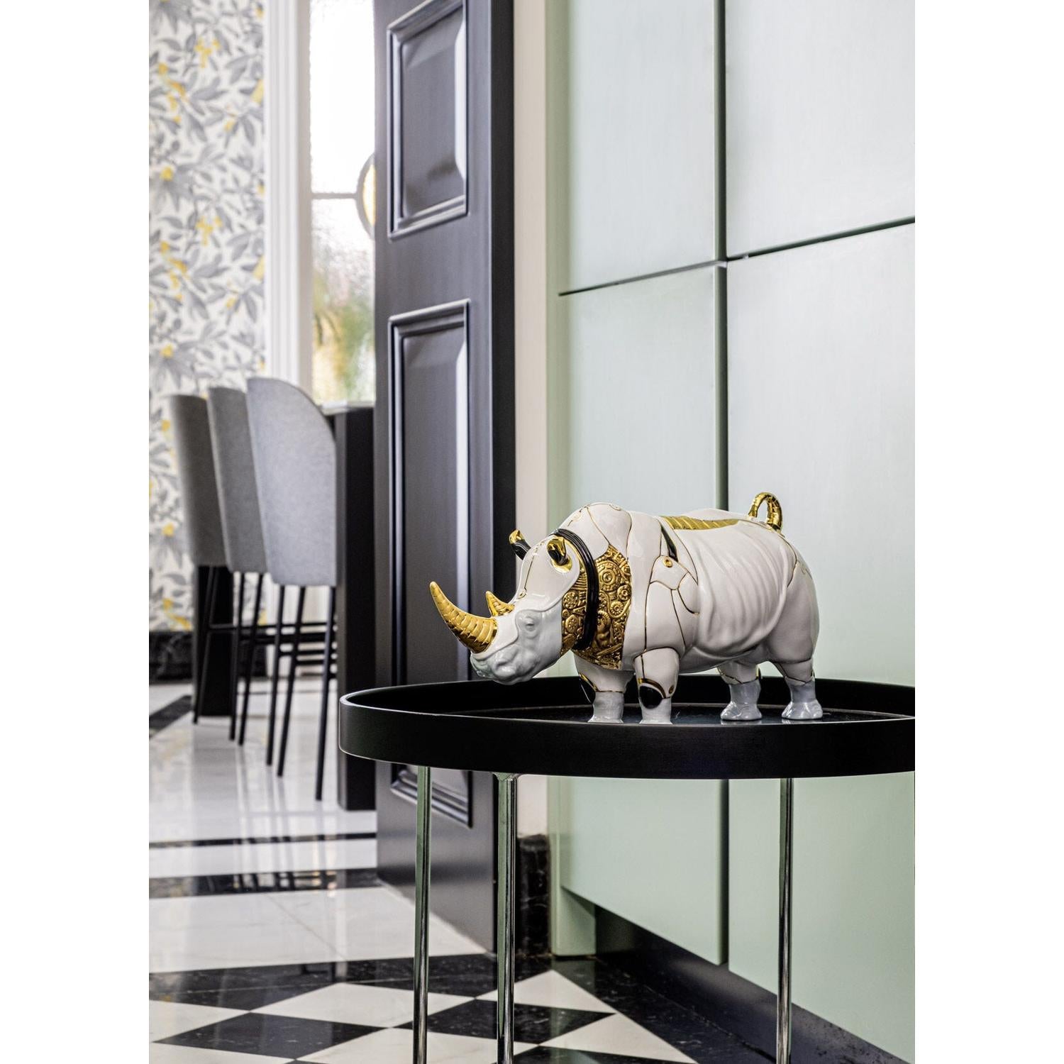 Le forme imponenti del rinoceronte, perfettamente modellate in porcellana bianca lucida, assumono un significato del tutto nuovo grazie a decorazioni e ornamenti ricchi di dettagli. I toni oro, nero e grigio-blu esaltano la figura, creando un contrasto sorprendente che cattura l'attenzione.