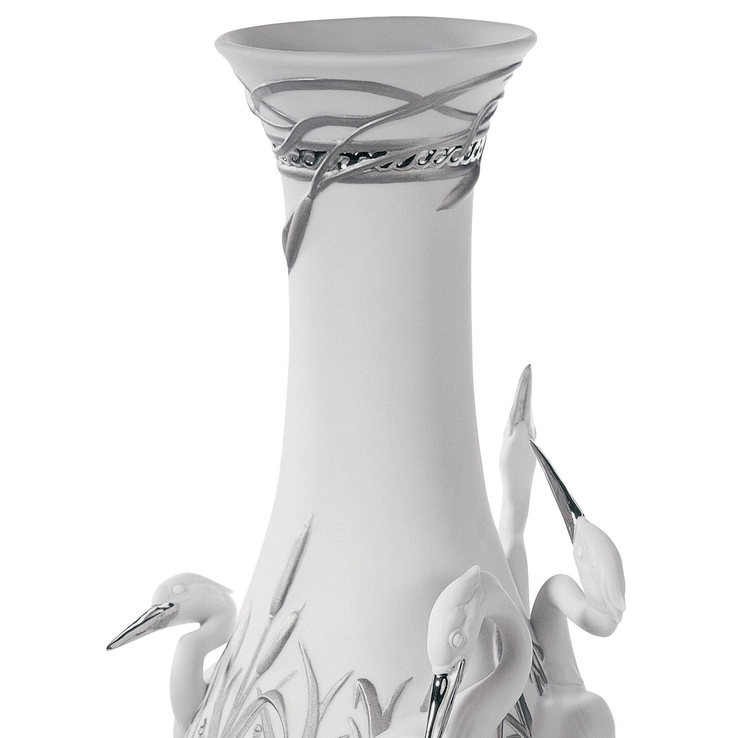 Questo vaso classico, impreziosito dalla presenza di eleganti aironi, si trasforma in un'opera dal carattere contemporaneo. Il segreto risiede nel contrasto tra la finitura opaca della porcellana bianca e i riflessi lucenti argentati, che esaltano i dettagli in rilievo. In particolare, gli elementi vegetali che decorano la base del vaso e altri dettagli artistici vengono valorizzati, creando un effetto visivo unico e affascinante.
