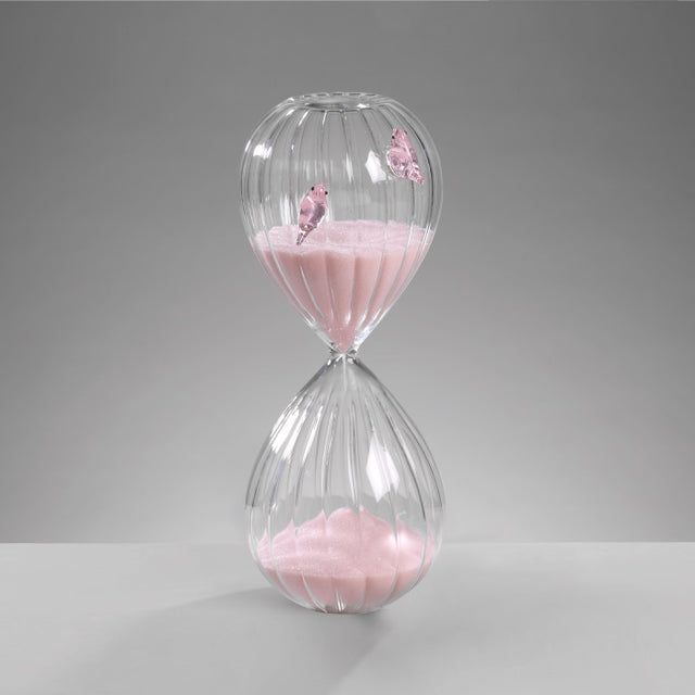 Regala ai tuoi spazi un tocco di eleganza senza tempo con questa raffinata clessidra in vetro di Mascagni Casa. Alta 20 cm, cattura lo sguardo con la sua sabbia rosa delicata e i romantici uccellini in rilievo, simbolo di leggerezza e armonia.