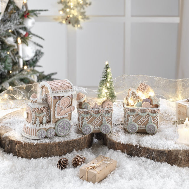 Scopri la magia del Natale con il Treno di Natale di Pan di Zenzero di Mascagni Casa! Questa incantevole decorazione in resina, arricchita da LED luminosi, cattura l'essenza delle festività con il suo design delizioso ispirato ai biscotti natalizi.