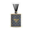 Profumatore per ambiente in una raffinata bottiglia di vetro verniciato con etichetta tessuta in jacquard e diffusorea forma di fiore in legno di betulla naturale realizzato a mano.