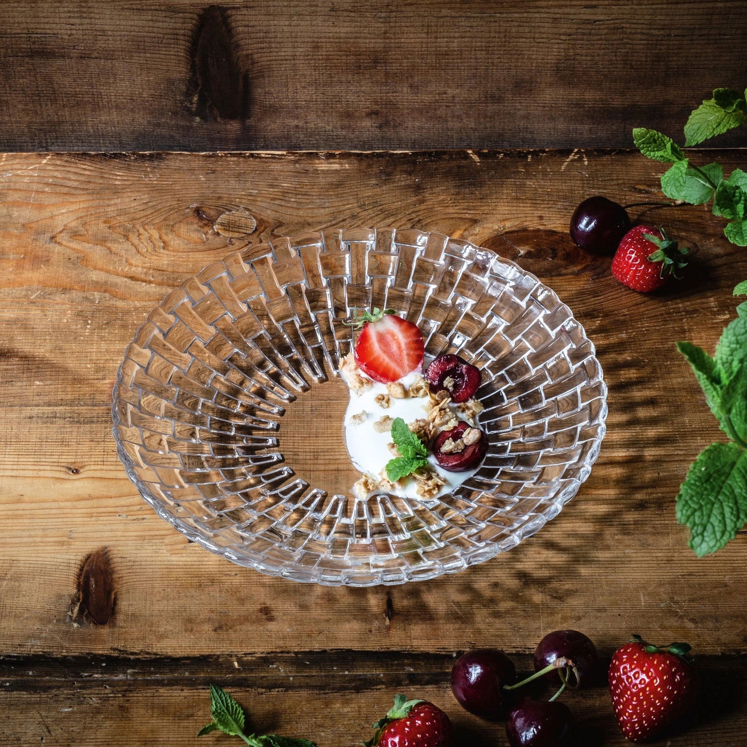 Questa ciotola dalla forma meravigliosa è ideale per servire insalate, frutta o antipasti. I bicchieri e le stoviglie della serie Bossa Nova possiedono lo stesso stile rilassato della danza da cui prendono il nome. La collezione è resa ancora più interessante dal motivo intrecciato creato sulla superficie del vetro trasparente, molto piacevole al tocco.