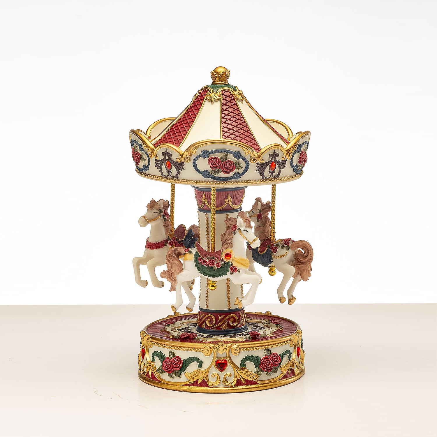 Immergiti nell'incanto delle feste con il carosello di Natale Noel by Lamart, un raffinato carillon in resina che cattura la magia natalizia. Decorato con dettagli dorati e intagli minuziosi, questo carosello presenta cavallucci che ruotano al ritmo di una dolce melodia, evocando l’atmosfera nostalgica dei ricordi d'infanzia.