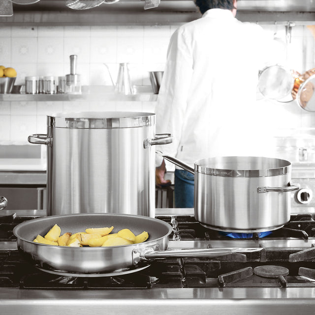 Serie 1100 Paderno. Finitura esterna ed interna satinata, bordo lucido. Manicatura tubolare in acciaio inox, anatomica, resistente al calore. Bordo rinforzato. Doppio spessore del fondo. Fondo termodiffusore sandwich (inox-alluminio-inox). Concavo a freddo e piano a caldo (sfruttamento del calore al 100%). Ideali per ogni tipo di cottura, gas, elettrica, vetroceramica e induzione. Tutti gli articoli sono dotati di speciale fondo termodiffusore adatto anche per piastre ad induzione.