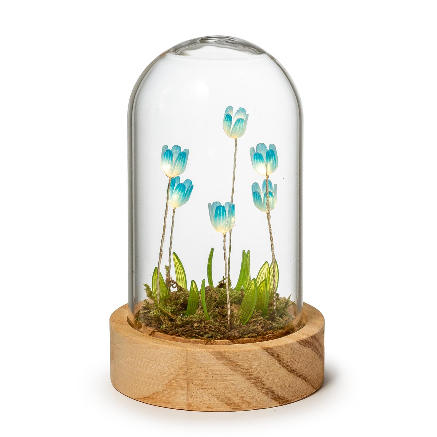 Entra in un mondo di incanto con la cupola in vetro con base in legno di Palais Royal, un raffinato scrigno che racchiude al suo interno un prato fiorito illuminato da soffusi LED.