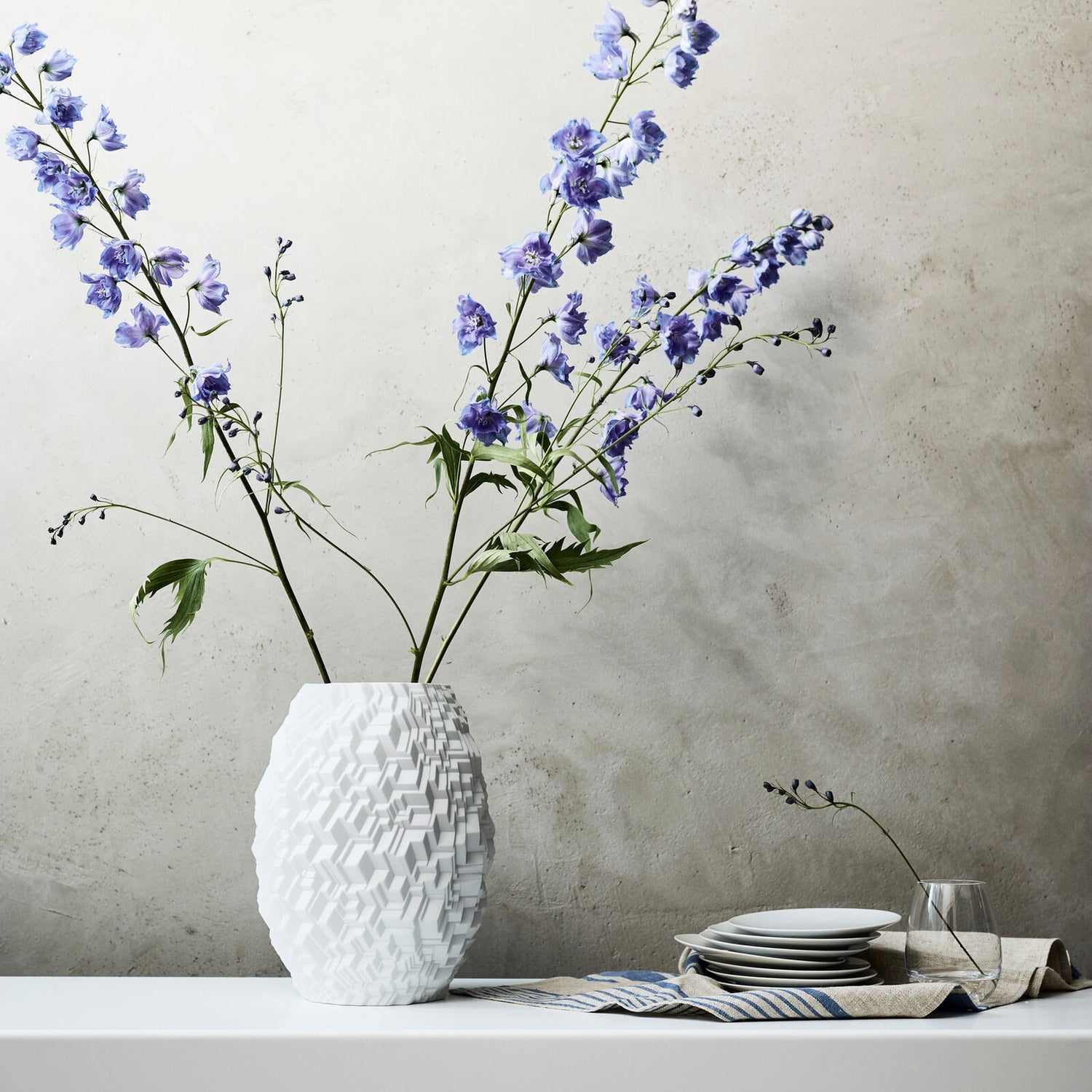 Una straordinaria collezione creata dal designer Cair Young. Motivi geometrici complessi che ricoprono i corpi di porcellana e li trasformano in oggetti scultorei con un sorprendente effetto 3D: i triangoli diventano fiori di ghiaccio, i corpi cubici formano una skyline. Il vaso Phi City è un tributo all'arte geometrica di Cair Young, che si manifesta attraverso un design minimalista e moderno. Questo vaso cattura l'essenza delle linee pulite e dell'estetica contemporanea, aggiungendo un tocco di sofisticatezza a qualsiasi spazio.