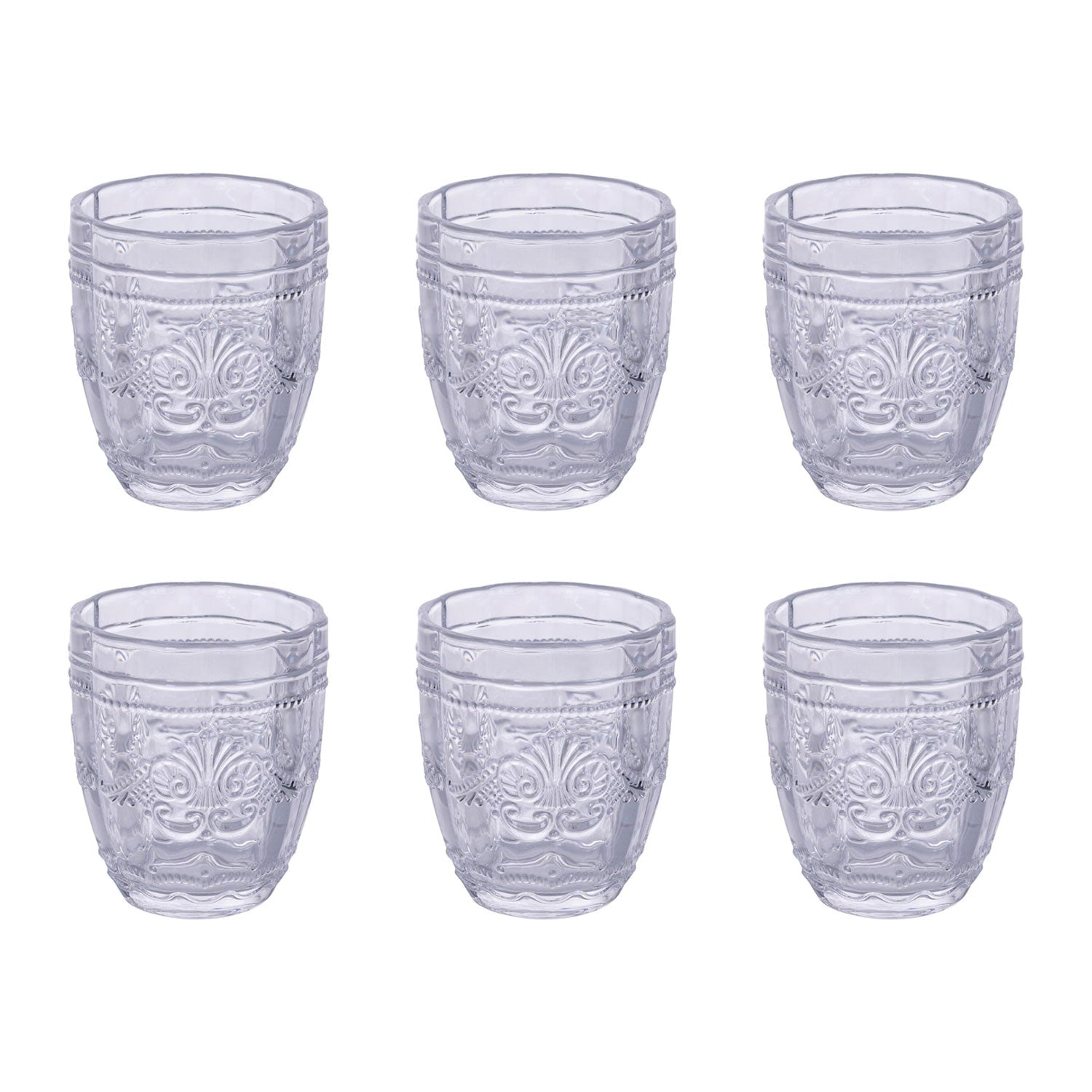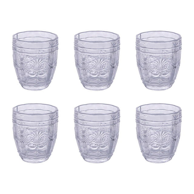 Porta in casa l’eleganza senza tempo con il set di 6 bicchieri Villa d'Este Home Tivoli. Realizzati in vetro di alta qualità, questi bicchieri si distinguono per le raffinate decorazioni in rilievo, ispirate agli antichi motivi barocchi. Ogni dettaglio cattura la luce con eleganza, donando un tocco di classe e ricercatezza alla tua mise en place.