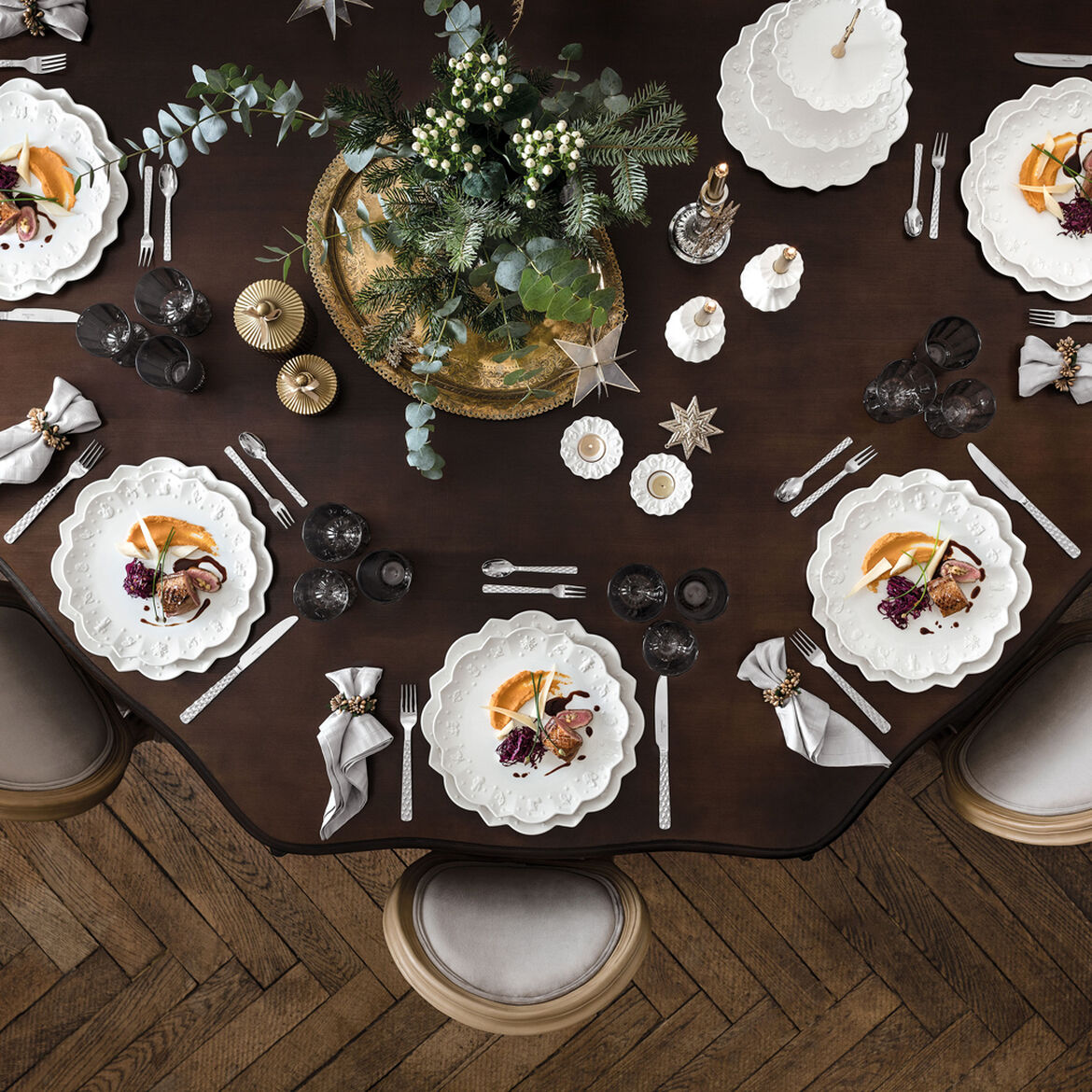 Toy's Delight Royal Classic si ispira alla forma dei nostalgici piatti di carta ed è decorata con un pregiato rilievo di porcellana. Questo rilievo raffigura motivi di tipici giocattoli dei Monti Metalliferi. La collezione dal bianco purissimo si abbina straordinariamente bene ai pezzi di Toy‘s Delight dai colori natalizi. Il piatto decorativo è perfetto per brunch natalizi o per un caffè pomeridiano e porta un piacevole senso di intimità a tavola. Portate in tavola l'atmosfera natalizia.