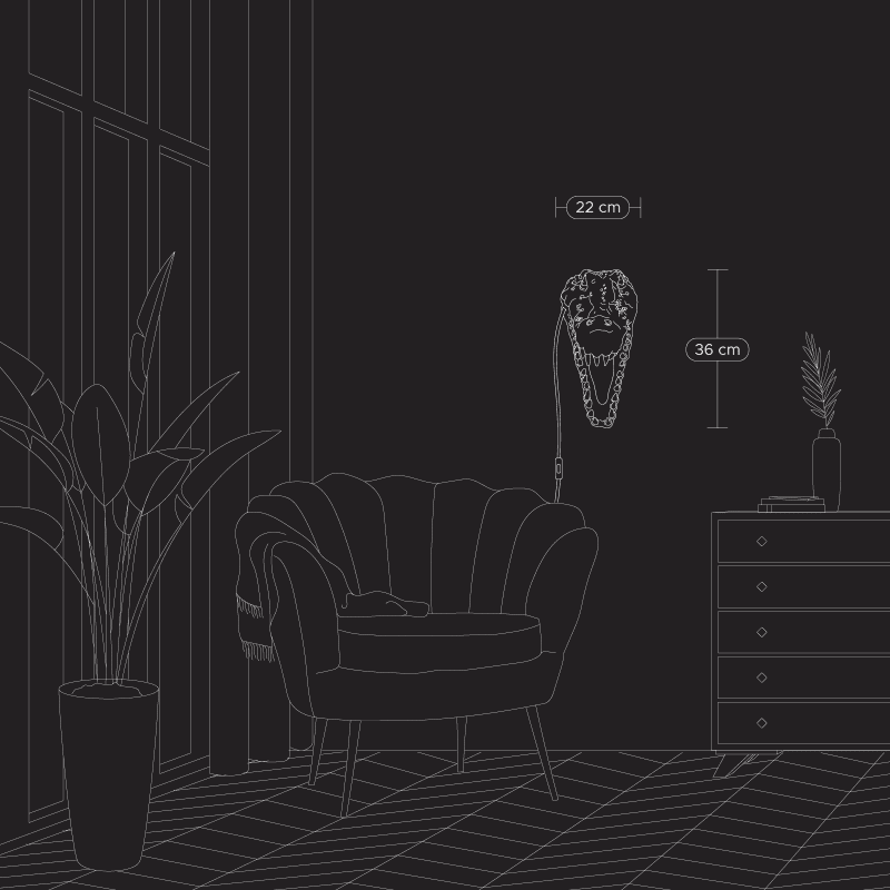 Alberto Aligatore fa parte della rinomata collezione di luci animali di WERNS®. Con questa lampada da parete scultorea, il duo di designer porta la vita selvaggia nel salotto di casa. Il coccodrillo dettagliato tiene la lampada nella sua bocca spalancata. Con le sue dimensioni di 43 cm, il è un elemento di richiamo centrale e perfetto per la parete.